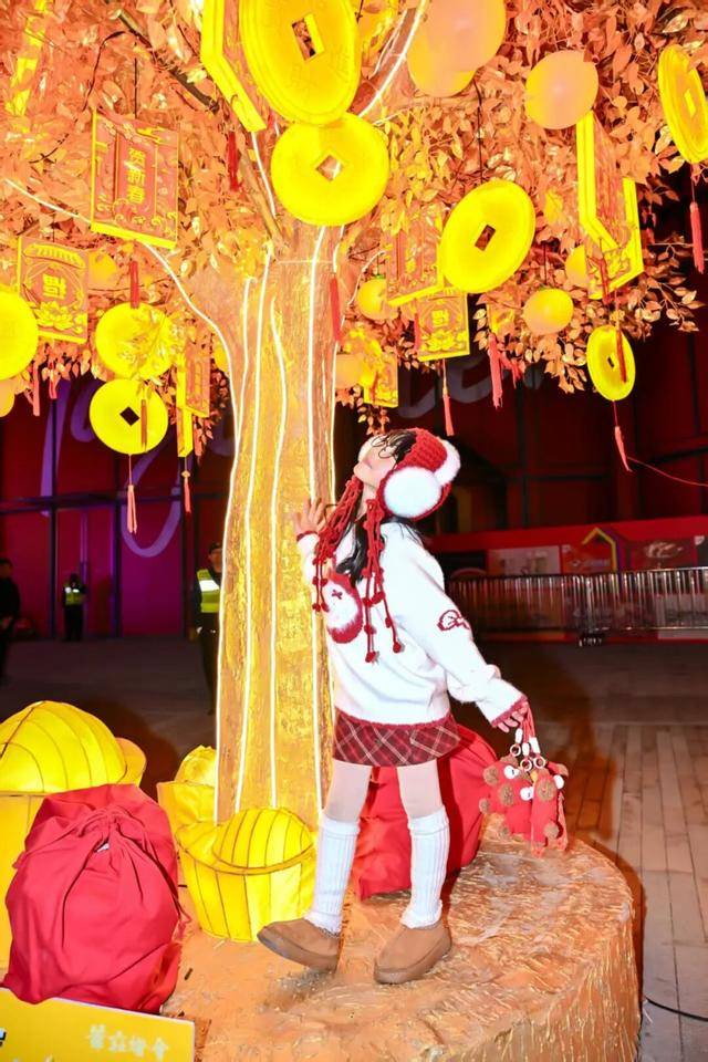 旁边有一棵6米高的“福树纳吉”,挂满了金灿灿的金元宝与红包,象征着“大吉大利、金银满屋”,成为市民祈福打卡的热门点位。 古韵灯笼柱环绕的“千灯拱月”,凭借沉浸式投影技术,让市民走入光影画卷,脚下灵动的游鱼随脚步穿梭,实现了传统花灯艺术的潮流表达。